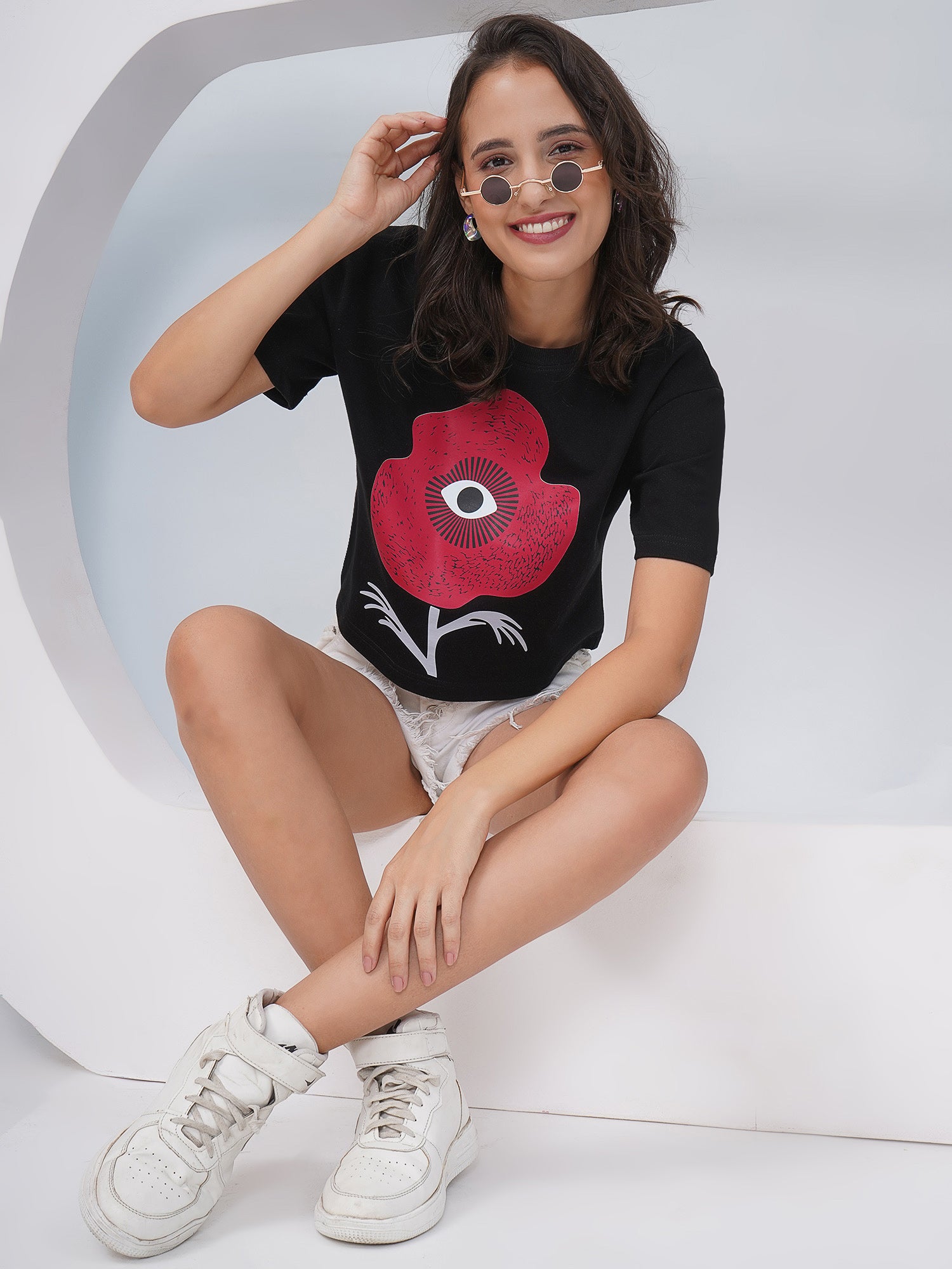 Make a bold statement with this Black Oversized Graphic Print Crop Top. Featuring a striking red and white abstract floral graphic with an eye-catching central design, this top adds an artsy, edgy vibe to your casual wardrobe. The relaxed oversized fit and cropped length make it perfect for pairing with shorts, jeans, or skirts for a trendy, street-style look.