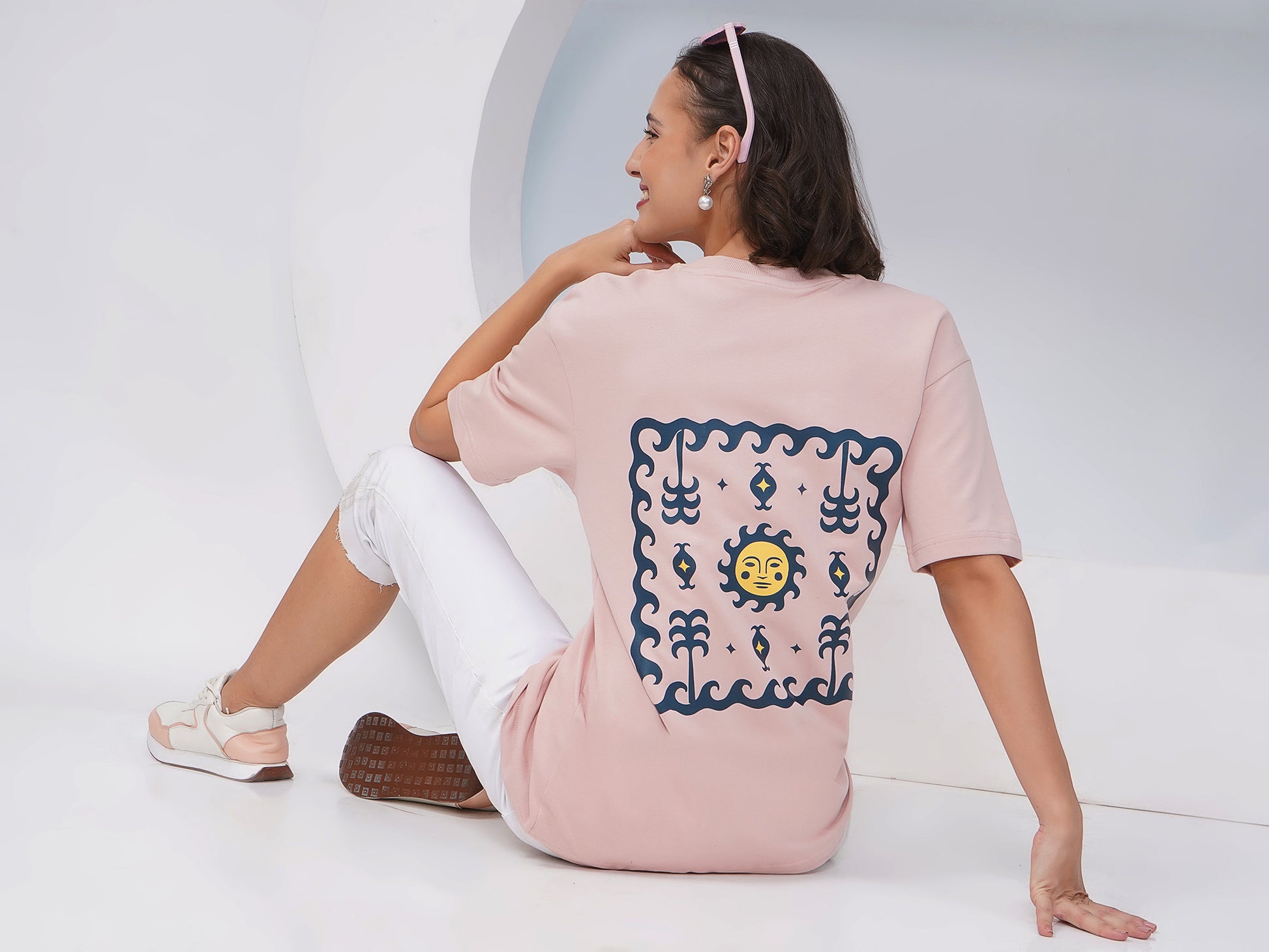 The design features a small, stylish sun motif printed on the front, while the back showcases a bold, large-scale graphic framed with waves, palm shapes, and symbolic details, all centered around the striking sun emblem. With its relaxed oversized fit and delicate blush pink tone, this tee effortlessly blends modern artistry with laid-back charm.