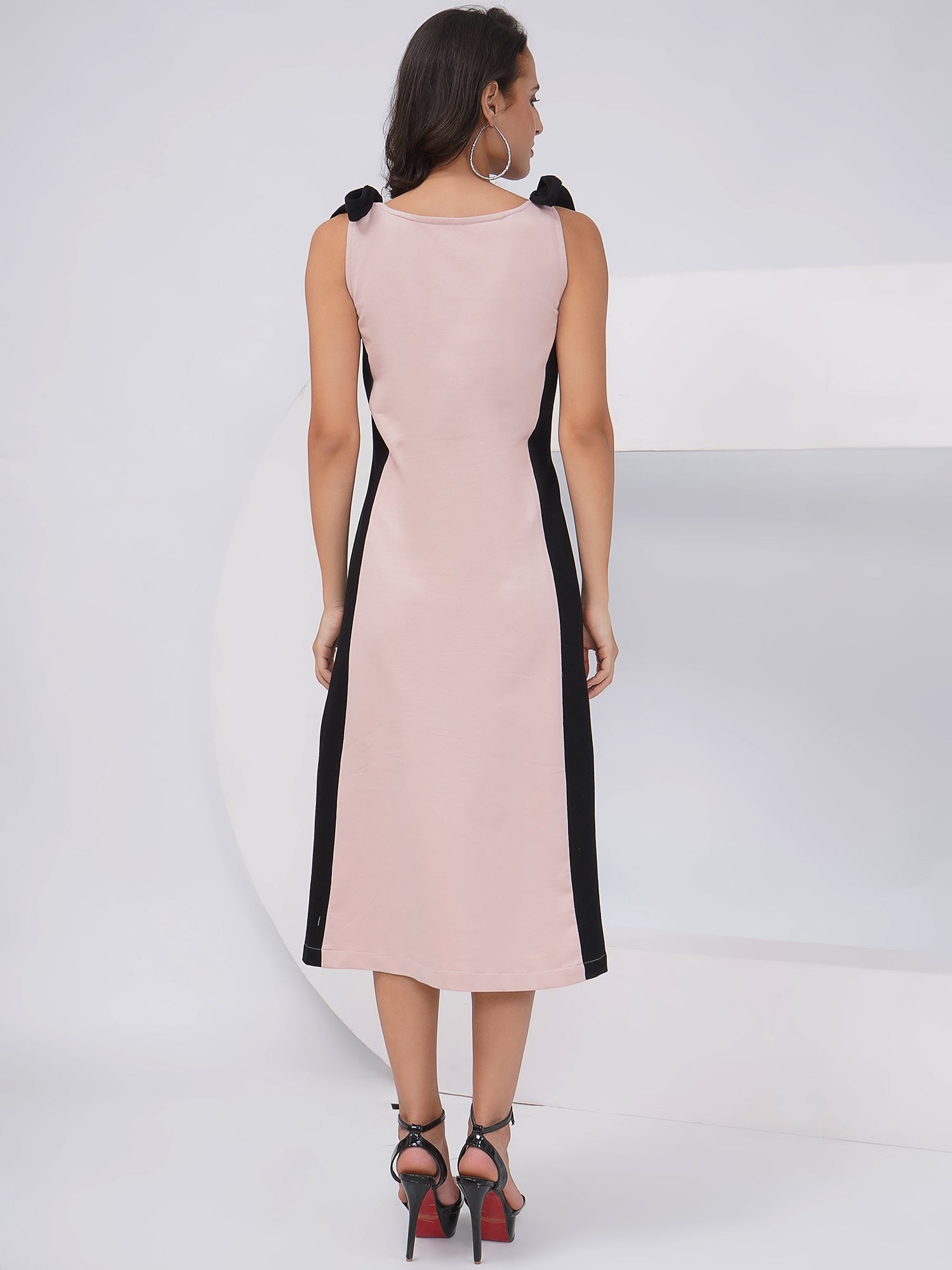 Turn heads with this stunning Colorblock Sleeveless Midi Dress, a perfect blend of chic and edgy. The soft blush pink base is dramatically contrasted by sleek black side panels, creating a flattering, elongated silhouette. The sleeveless design with stylish shoulder tie details adds a playful yet sophisticated touch.