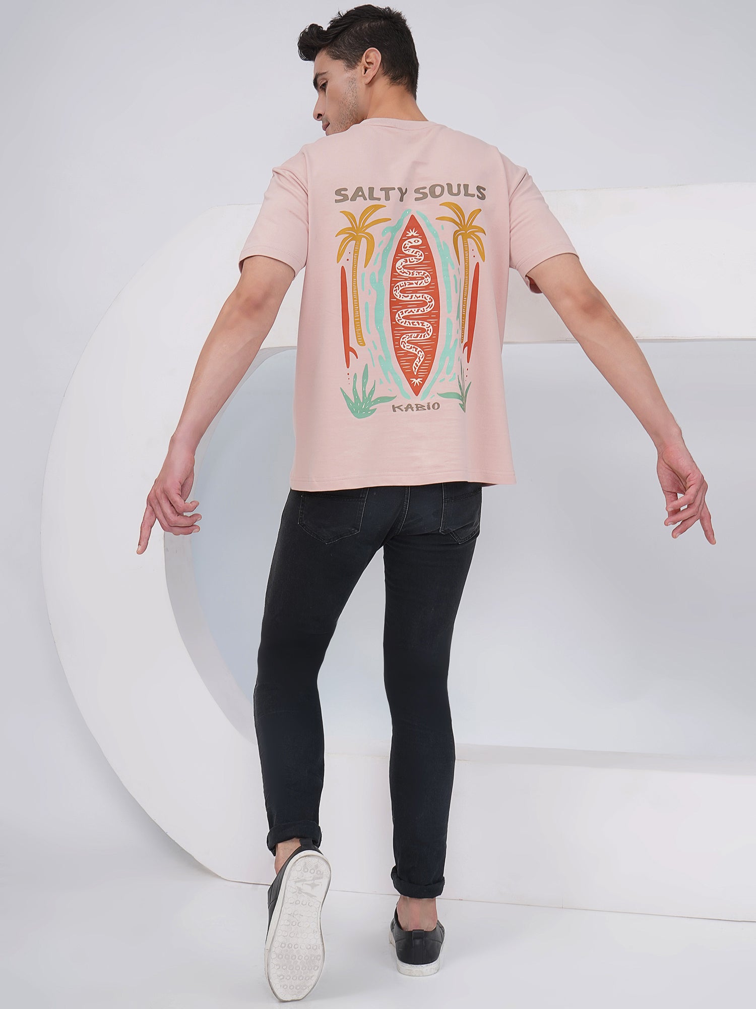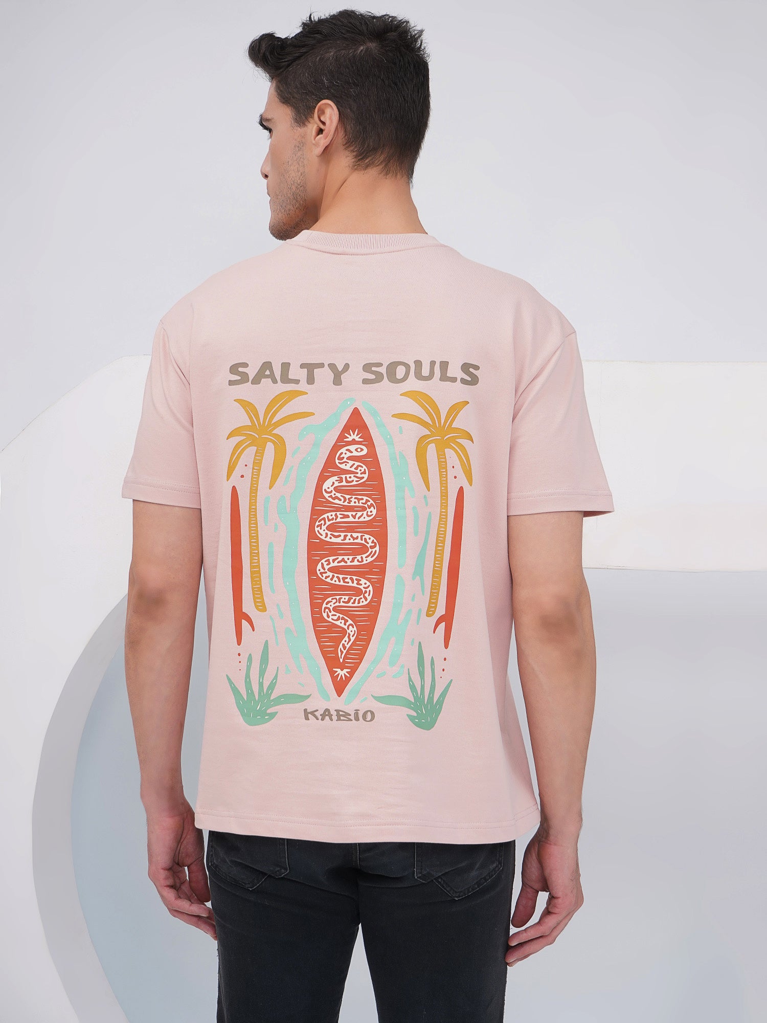 Bring the beach vibes wherever you go with this pastel pink oversized t-shirt, showcasing a bold, tropical-inspired back graphic featuring a tribal surfboard, palm trees, and the phrase “SALTY SOULS.” The front keeps it clean with a single palm tree motif on the chest, adding just the right touch of summer flair. Crafted from 100% premium heavy gauge cotton, this tee is designed for all-day comfort with a structured yet relaxed silhouette.