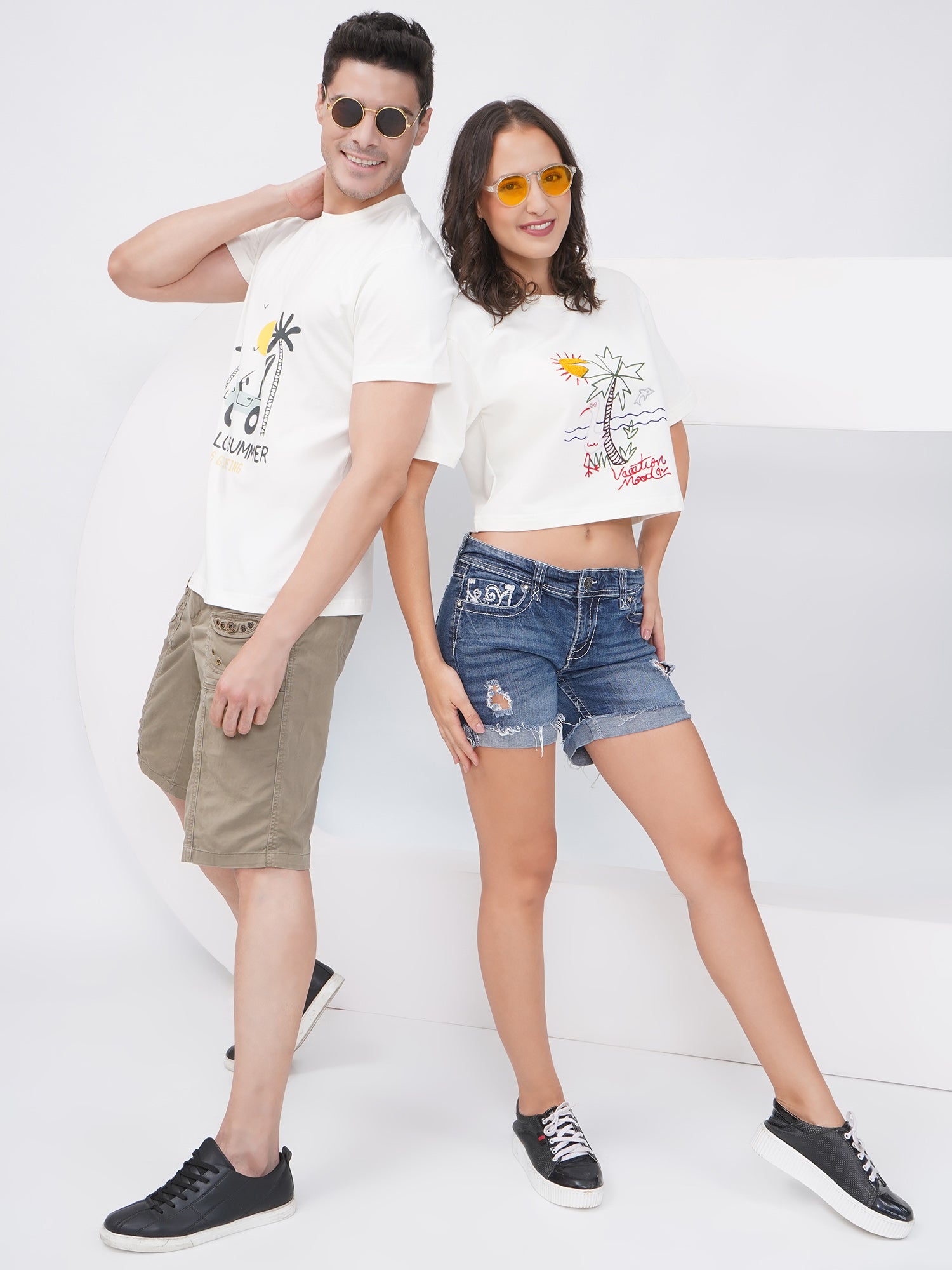 Celebrate sunny vibes and beach dreams with this playful couple's set featuring coordinated summer-inspired designs. The men's regular fit t-shirt features a vibrant Jeep and palm tree print with the words “Hello Summer – Let’s Go Surfing,” while the women’s oversized cropped top stands out with charming embroidery of a coastal scene and the phrase “Vacation Mood On” Both pieces are made from 100% pure cotton, ensuring softness and breathability for all-day comfort. The off-white color enhances the relaxed, carefree summer aesthetic, perfect for vacations, beach days, or casual hangouts.