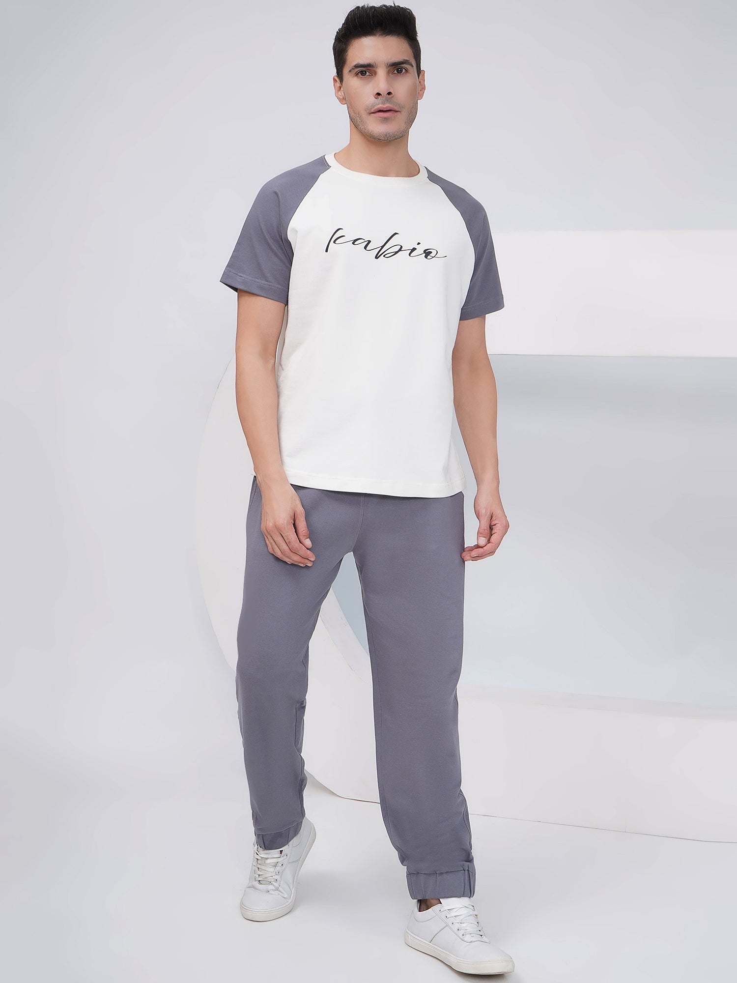 Step up your casualwear game with this stylish and comfortable co-ord set, made from 100% pure cotton for breathable, all-day ease. The set features a modern colorblock oversized T-shirt with contrasting sleeves and a bold "Kabio" script on the front, paired with solid grey joggers designed with practical side pockets.