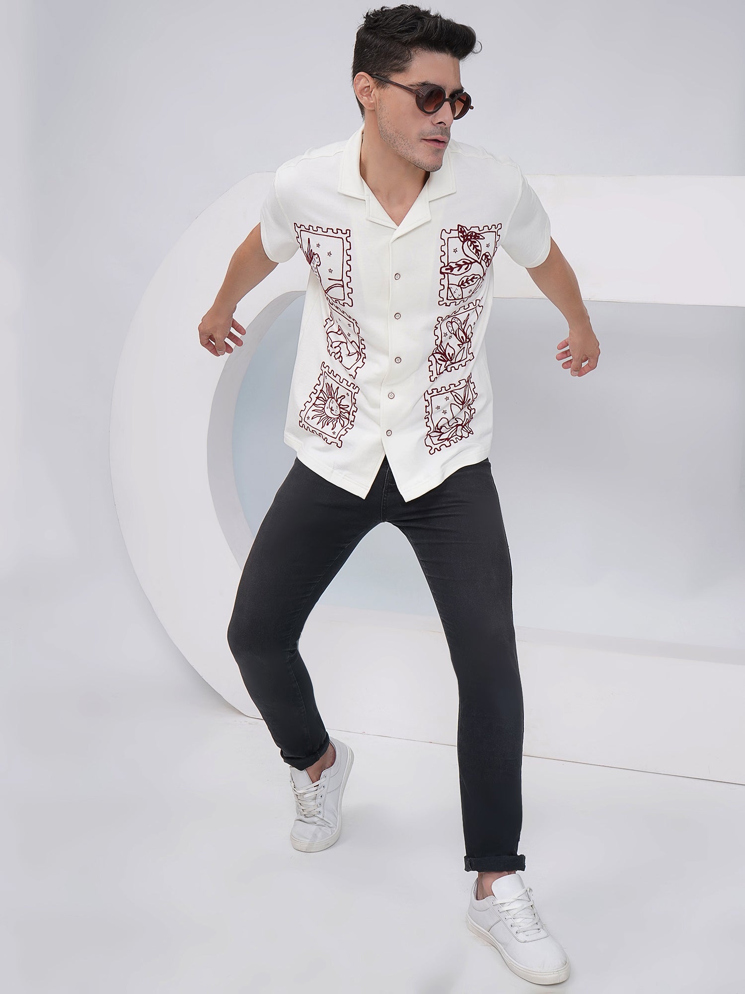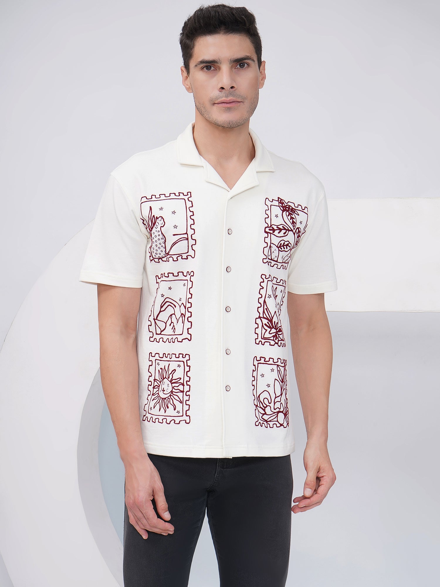 Elevate your casualwear with this Off White Embroidered Heavy Cotton Shirt, made from 100% premium heavy gauge cotton for a luxurious and durable feel. The shirt features intricate burgundy embroidery across the front, designed in artistic stamp-like frames showcasing sun, nature, and abstract elements, adding a creative and standout flair to your look. Designed with short sleeves, a spread collar, and a button-down closure, it offers a comfortable fit perfect for everyday style.
