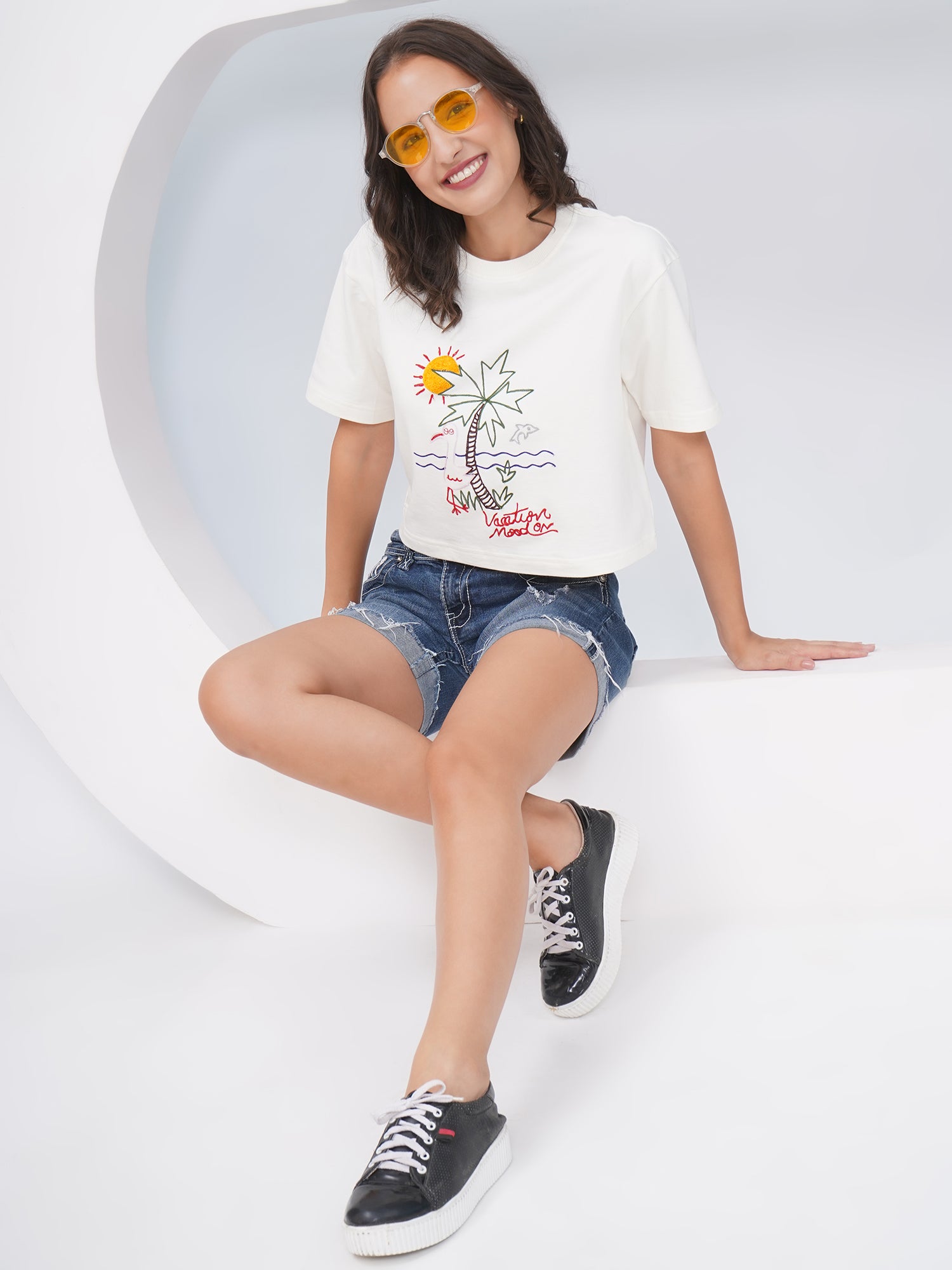 Channel effortless summer vibes with this Off-White Embroidered Oversized Crop Top, designed to keep you cool and stylish. Featuring playful vacation-themed embroidery with a palm tree, sun, and waves, this crop top instantly puts you in a laid-back mood. The relaxed, oversized fit combined with the cropped length offers a trendy silhouette that pairs perfectly with high-waisted shorts or jeans.