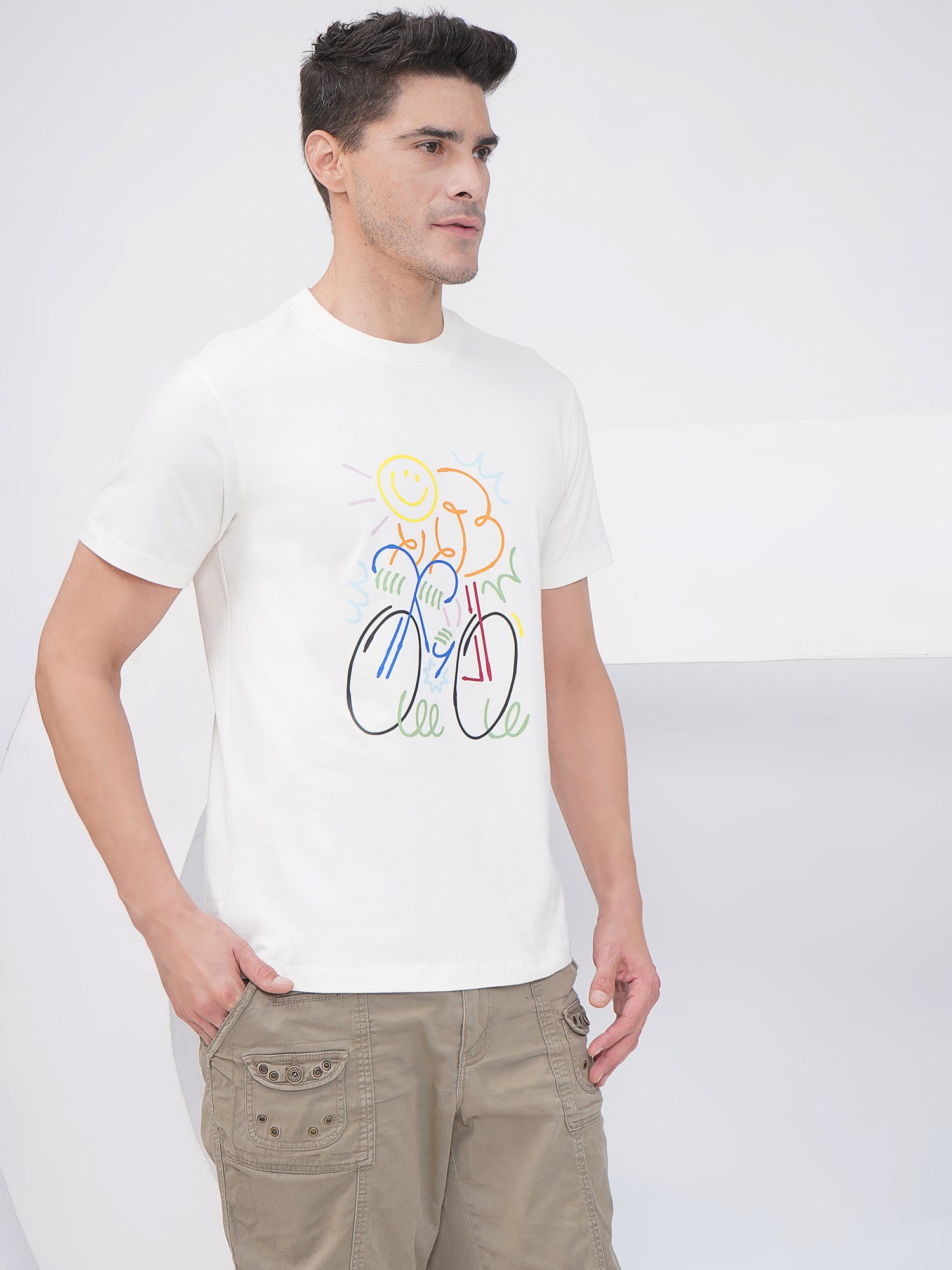 The standout feature is the fun, colorful front print that depicts a whimsical bicycle illustration. Rendered in vibrant line art, it shows a cyclist with a cheerful yellow smiley face, bright orange body, and dynamic blue, green, and red accents, evoking a sense of movement and joy. The design is fresh and lively, making it a great choice for those who love a playful twist in their wardrobe.