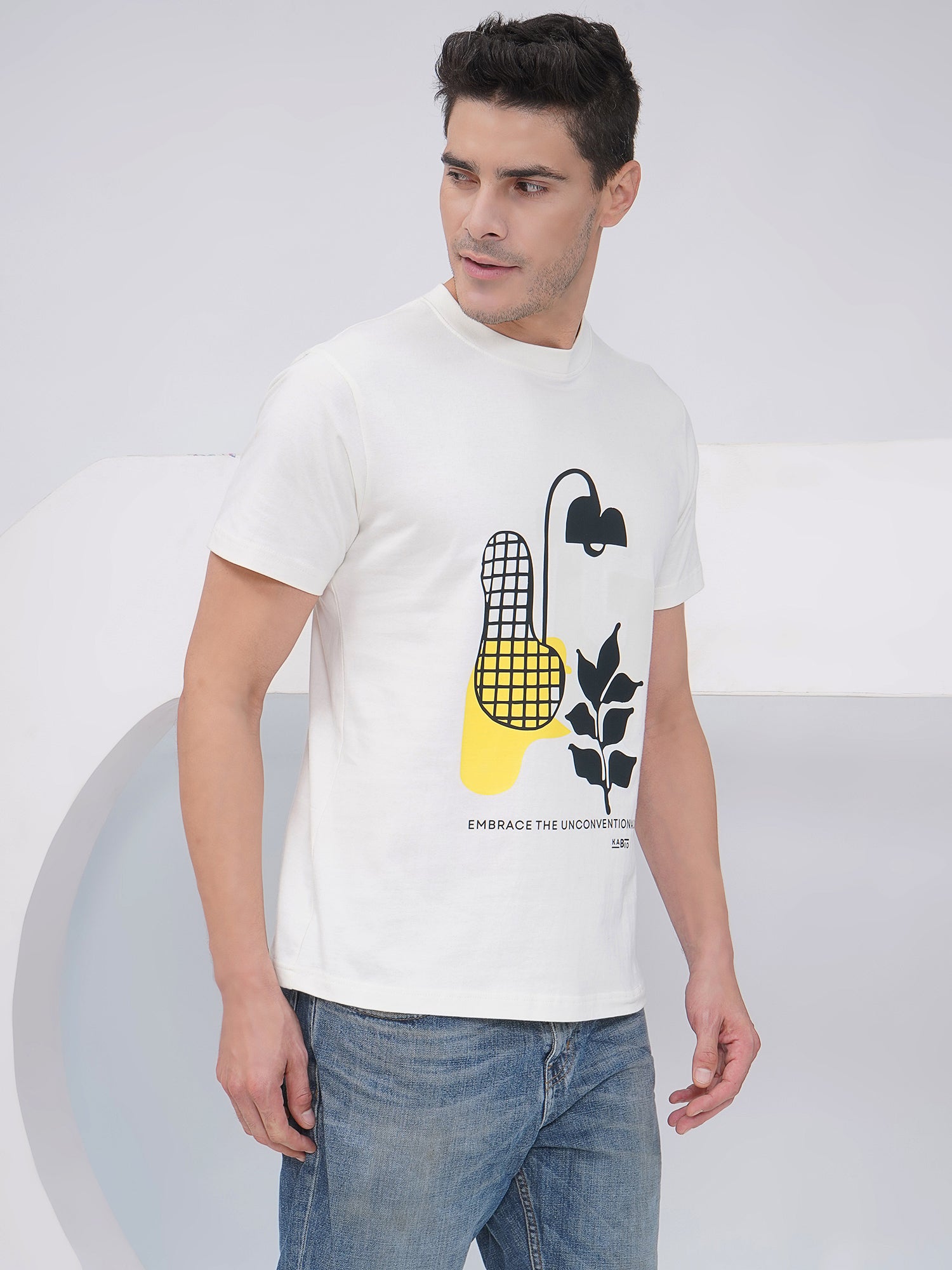 The t-shirt features modern, abstract print with stylized plants in black and yellow tones, paired with the phrase “EMBRACE THE UNCONVENTIONAL” for a bold, artistic touch.