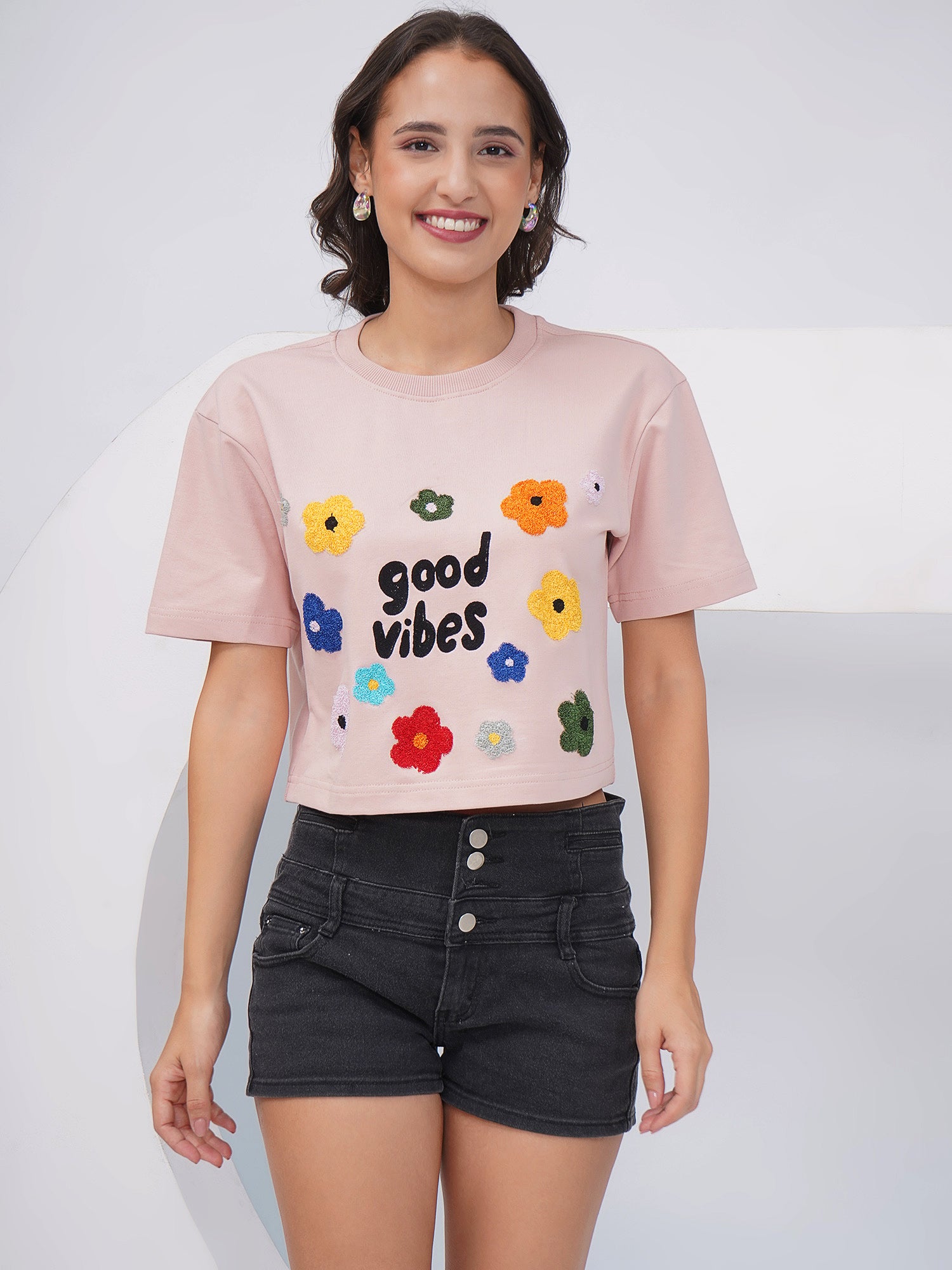 - Design: Multicolored Floral Embroidery with “Good Vibes” Text, Crew Neck, Short Sleeves