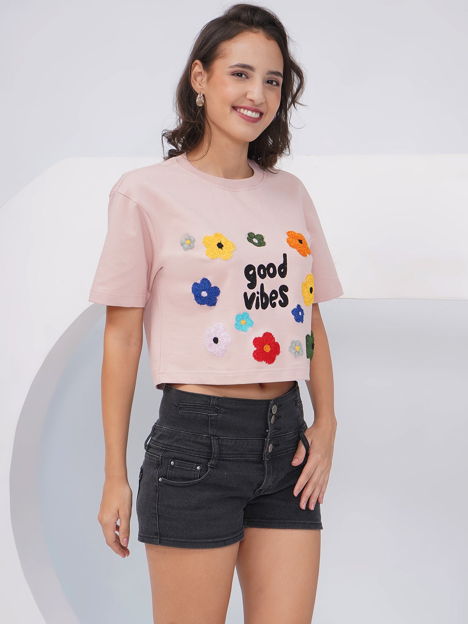 Spread positivity and style with this Pink “Good Vibes” Embroidered Oversized Crop Top. Featuring playful multicolored floral embroidery and a bold “good vibes” text at the center, this top brings a cheerful, laid-back charm to your casual looks. Its cropped length and relaxed oversized fit make it perfect for pairing with shorts, jeans, or skirts for an easygoing weekend outfit.