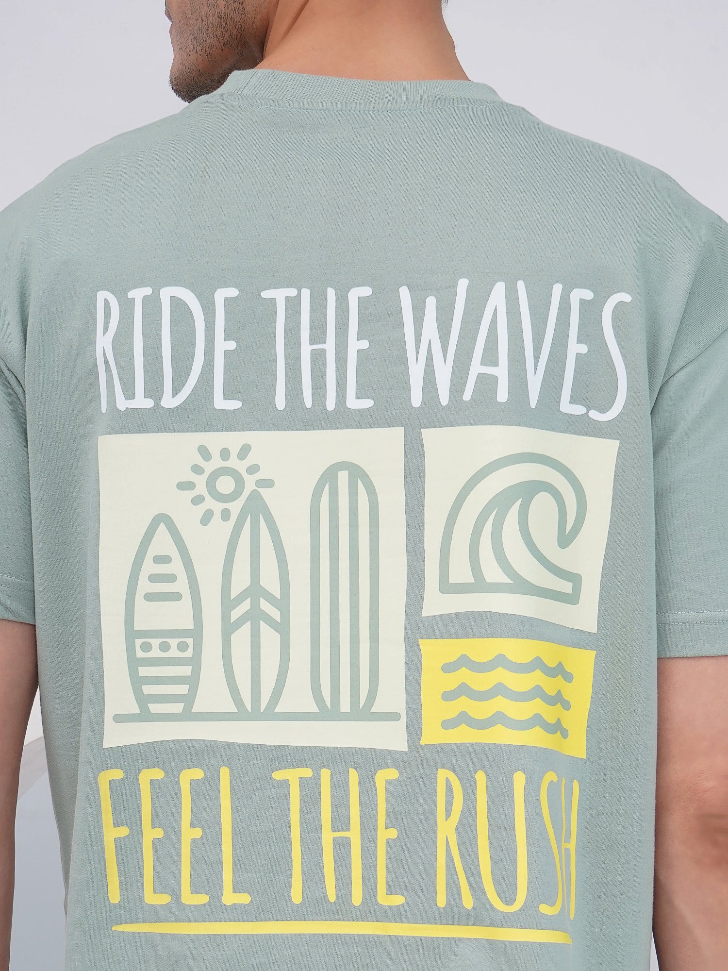 Step into laid-back beach vibes with this sage green oversized t-shirt featuring a bold surf-inspired back graphic that reads “RIDE THE WAVES / FEEL THE RUSH.” The minimalist front is marked with a clean wave motif on the chest, offering a fresh balance of subtlety and statement. Crafted from 100% premium heavy gauge cotton, this oversized tee is all about comfort, structure, and easy-going style.