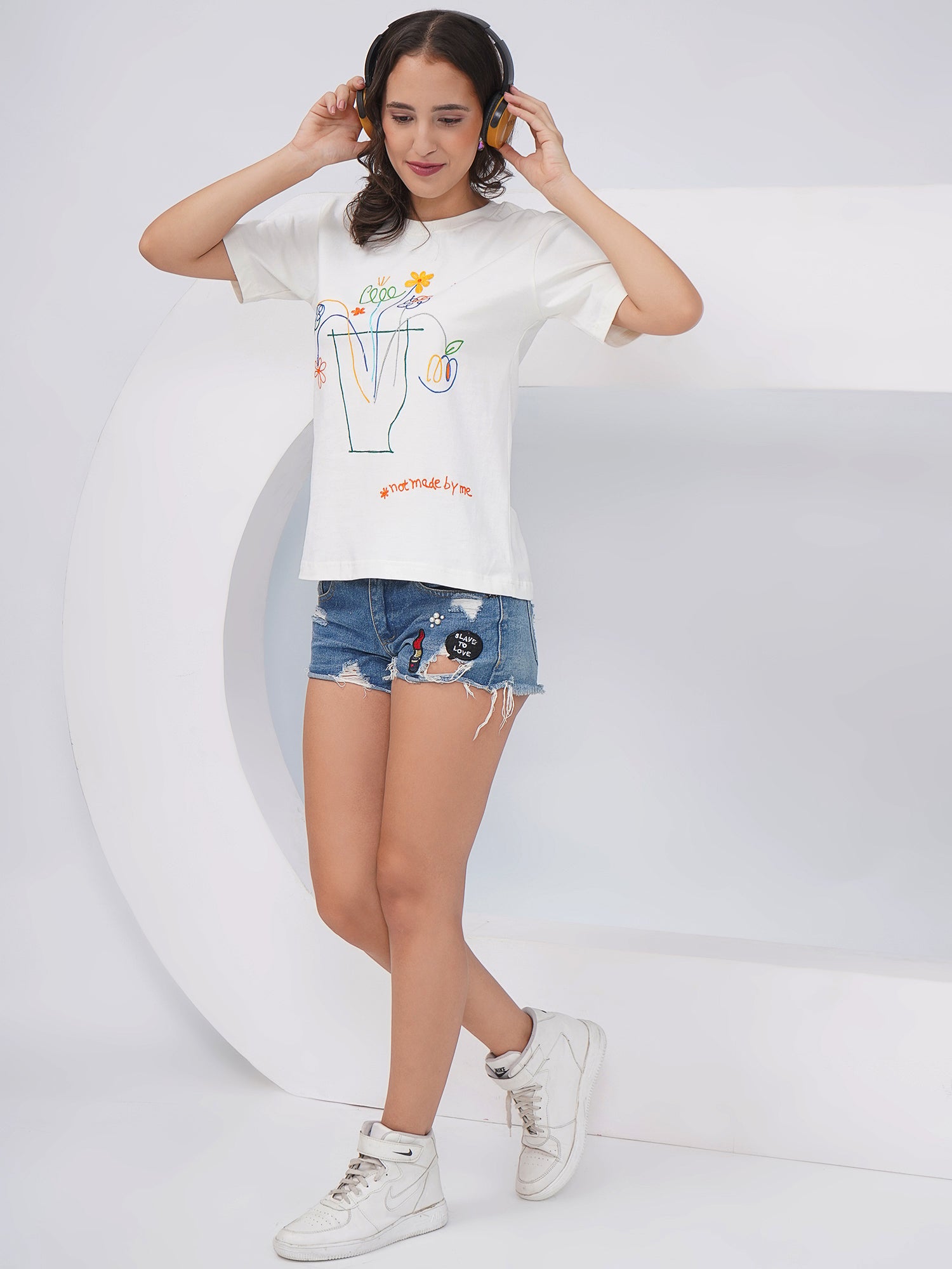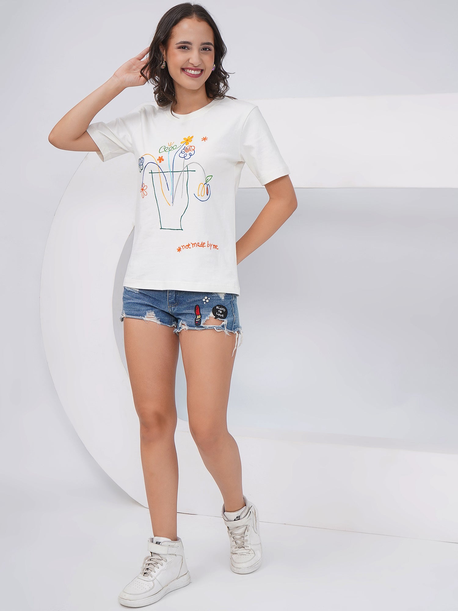 Add a touch of charm to your casual wardrobe with this Off-White Regular Fit T-Shirt for women, featuring a playful embroidered floral vase motif and the quirky message "not made by me". Crafted from 100% pure cotton, this tee combines breathable comfort with unique design. The vibrant multicolor embroidery brings an artistic flair to a classic silhouette, making it perfect for relaxed days with a creative twist.